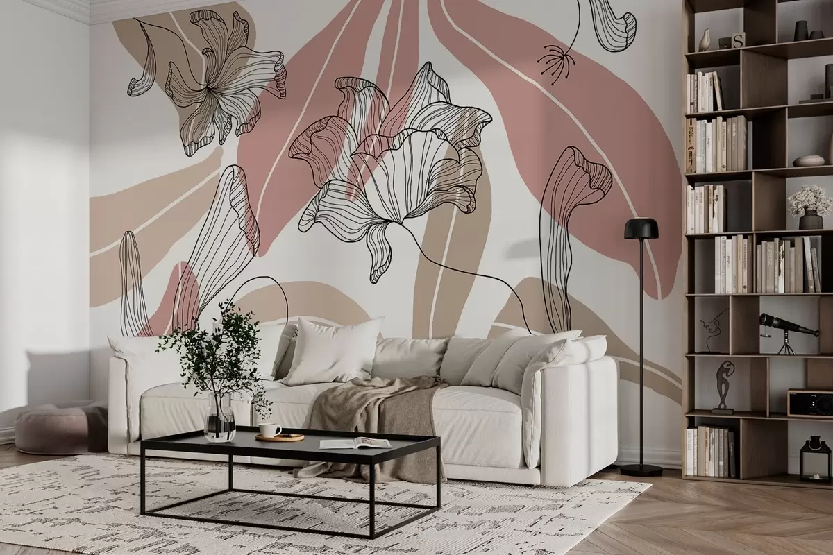 Fotobehang abstracte bladeren en bloemen in poederachtige en beige tinten N° w04499