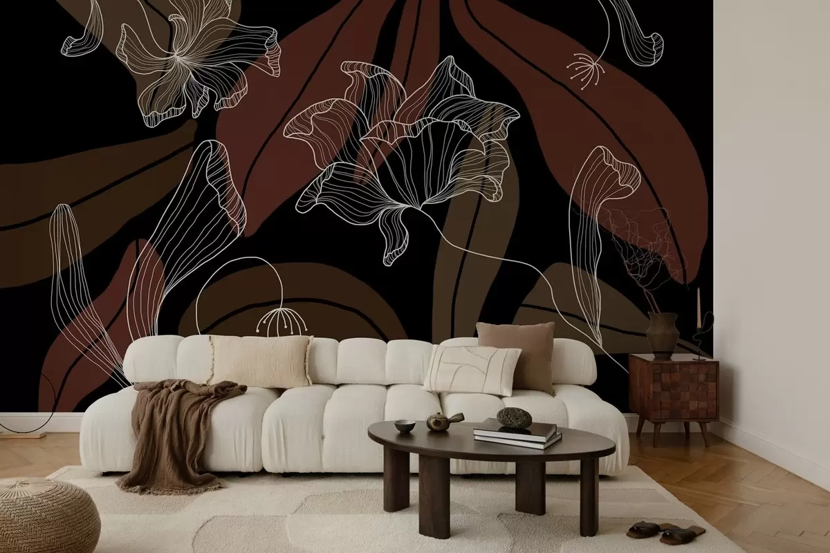 Fotobehang abstracte bladeren en bloemen in poederachtige en beige tinten op een donkere achtergrond N° w04499v3