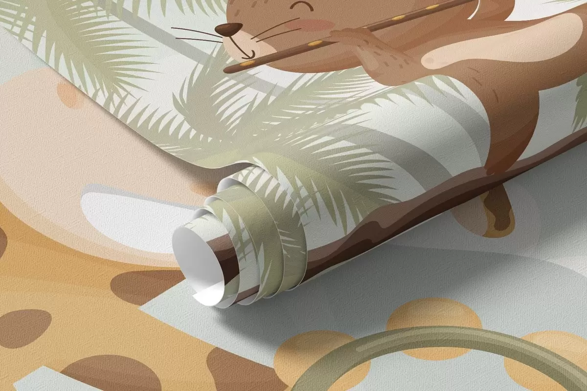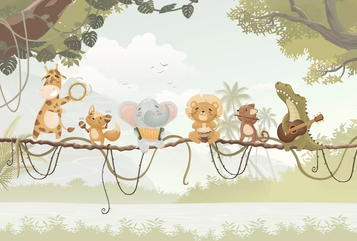 Fotobehang Dieren met muziekinstrumenten tegen een tropisch landschap N° w04505v1