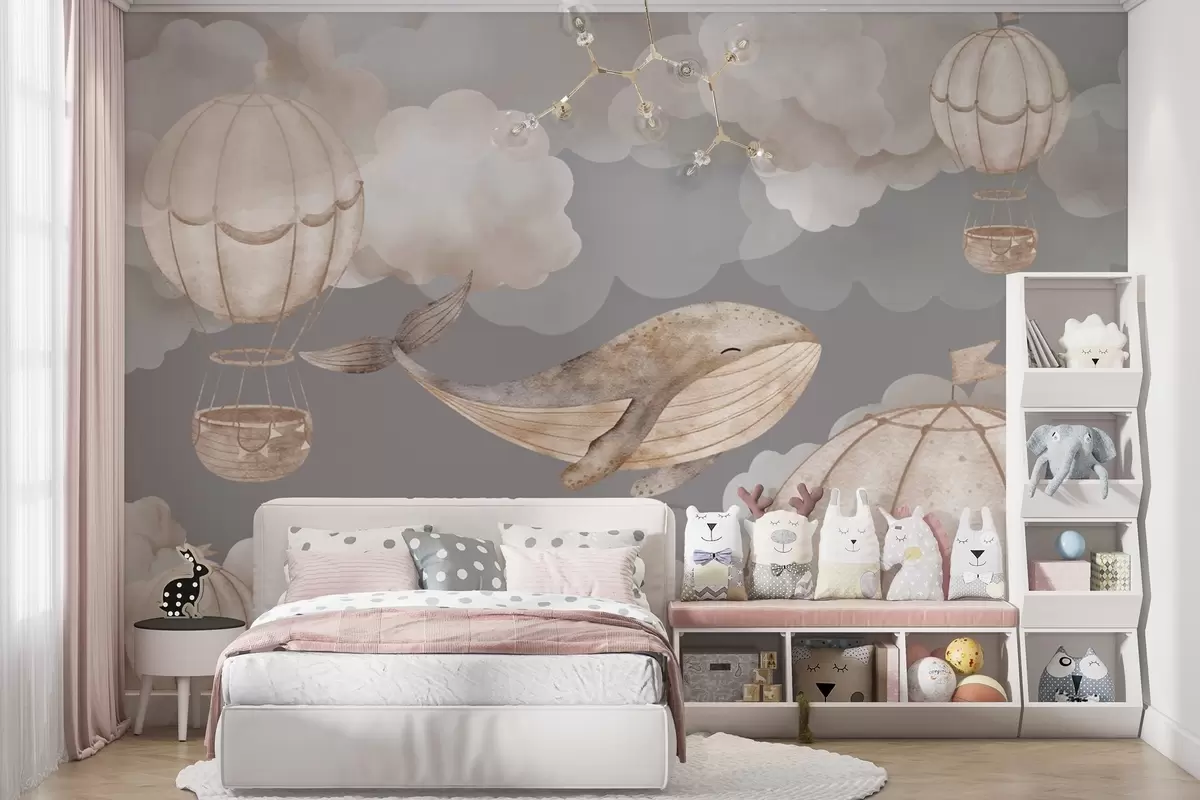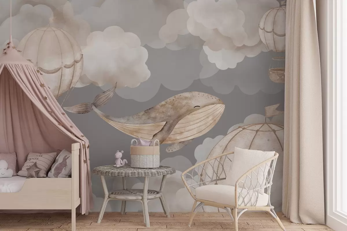 Fotobehang Walvissen en heteluchtballonnen tussen zachte wolken N° w04522