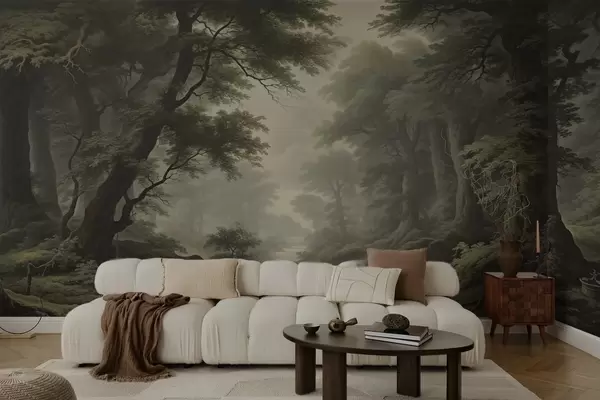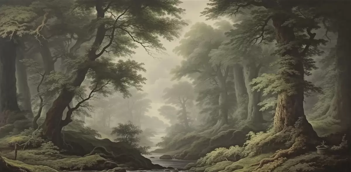 Fotobehang Mistig bos met rivier en hoge oude bomen N° w04555