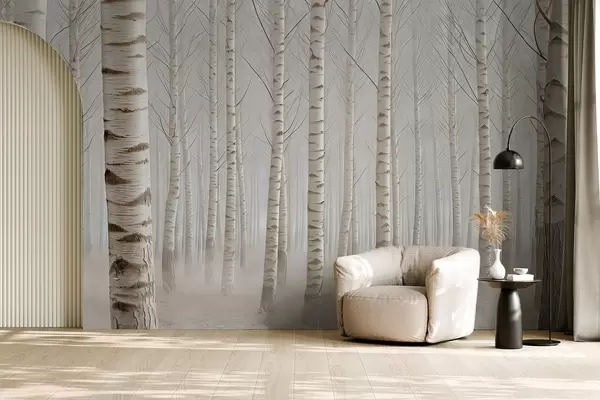 Fotobehang Berkenbos in de mist, licht minimalisme N° w04574