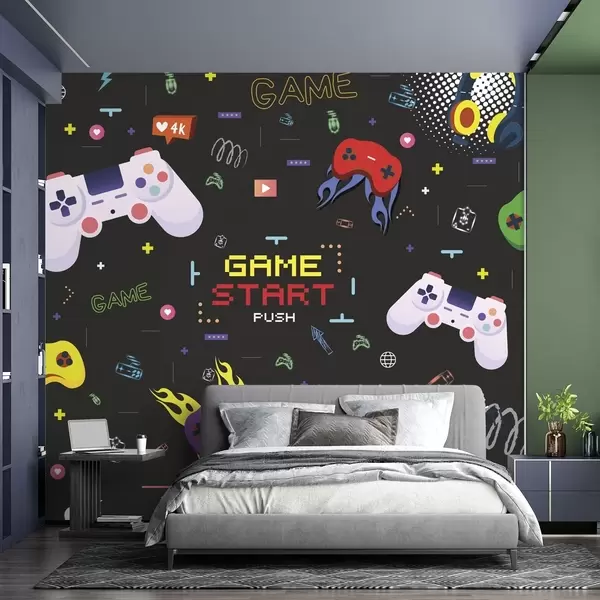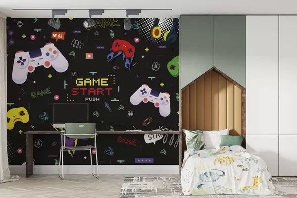Fotobehang Opvallend gamerpatroon met consoles en gepixelde tekst N° w04581