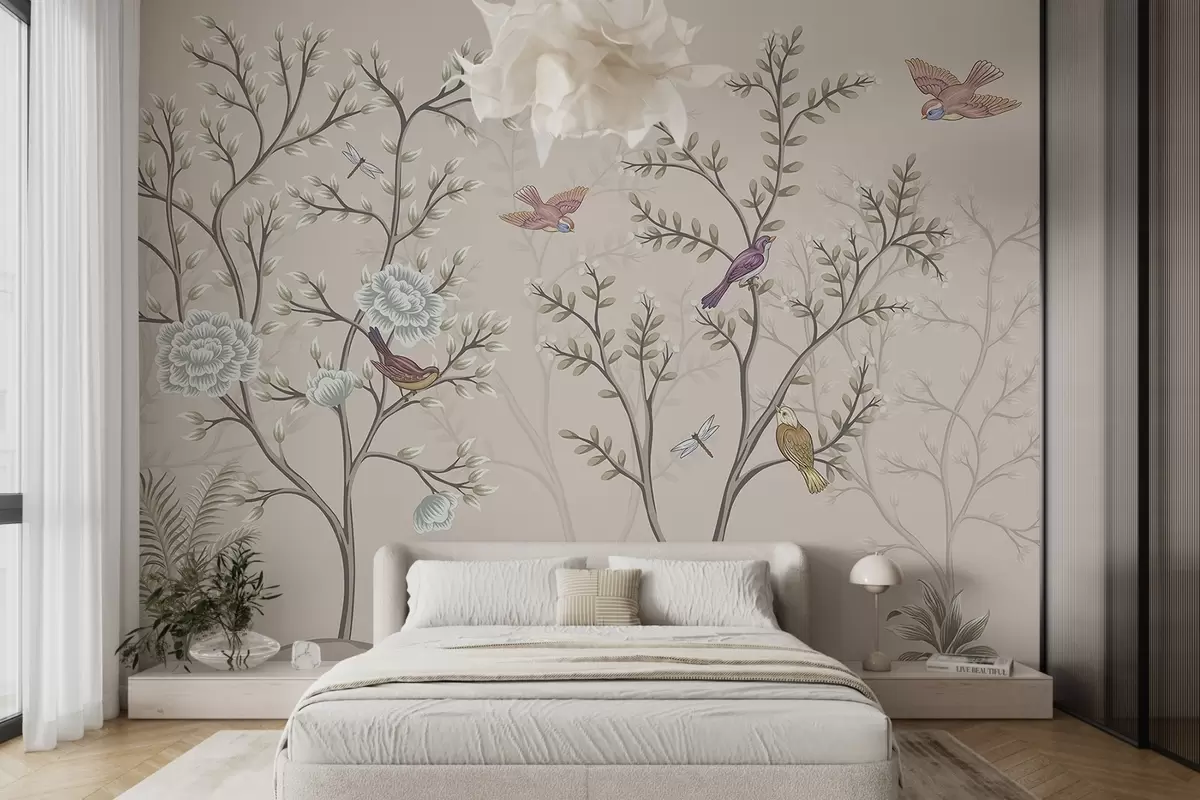 Fotobehang Bomen met vogels en bloemen N° w04605
