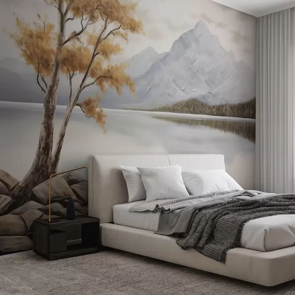 Fotobehang Herfstboom bij een bergmeer, rustige pasteltinten N° w04611