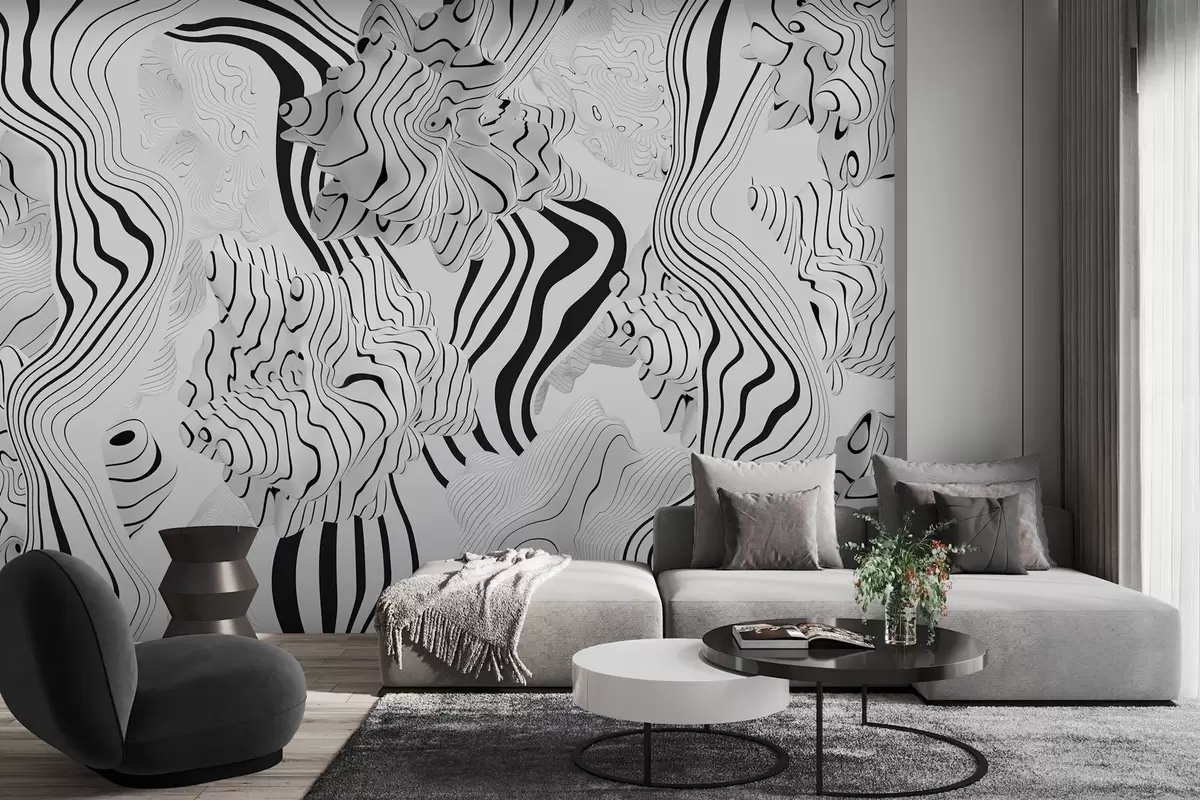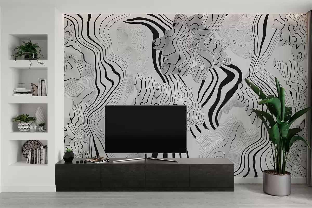Fotobehang abstracte organische vormen in 3D-stijl in witte en grijze tinten met zwarte strepen N° w04627