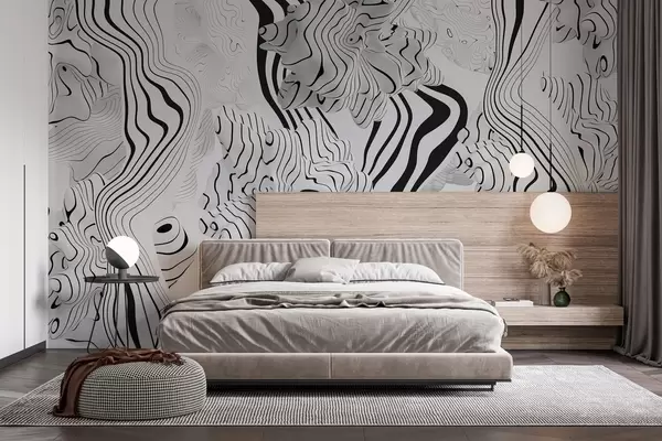 Fotobehang abstracte organische vormen in 3D-stijl in witte en grijze tinten met zwarte strepen N° w04627