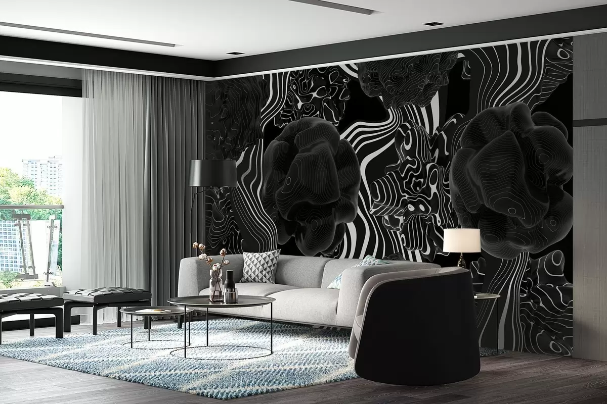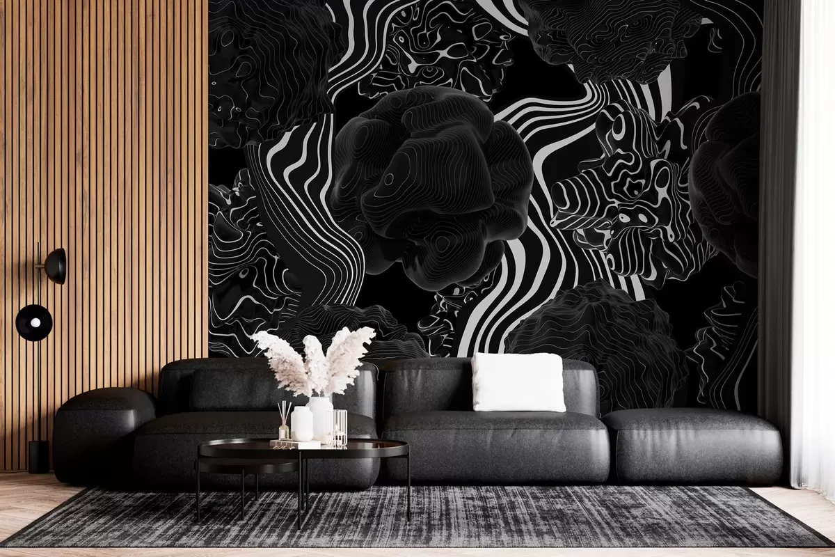 Fotobehang abstracte organische vormen in 3D-stijl in zwarte tinten met witte strepen N° w04628
