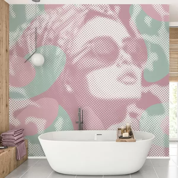 Fotobehang portret van een vrouw op een luipaardachtergrond in een gestippelde stijl in roze en groene tinten N° w04630v2