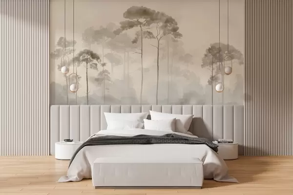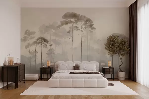 Fotobehang lichte silhouetten van dennenbomen in aquarelstijl N° w04634