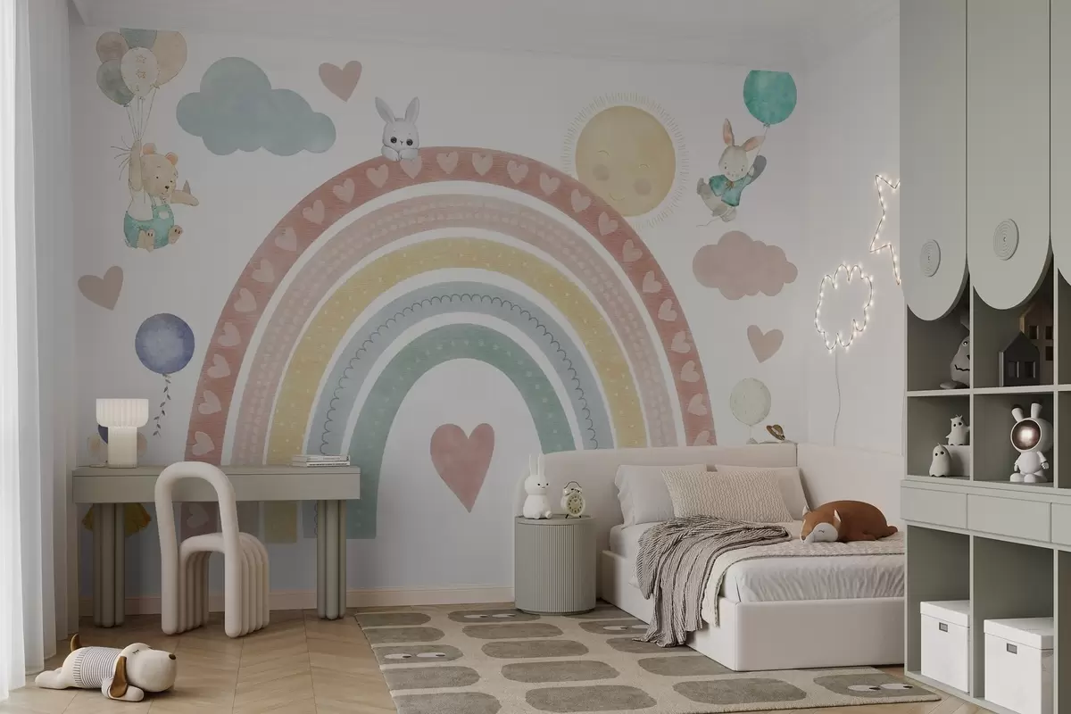 Fotobehang Pastelkleurige regenboog met hartjes, dieren en ballonnen N° w04681