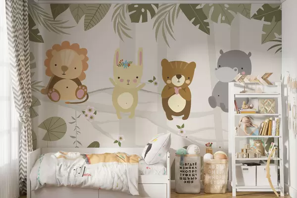 Fotobehang Schattige leeuw, konijn, beer en nijlpaard tussen de bladeren N° w04682