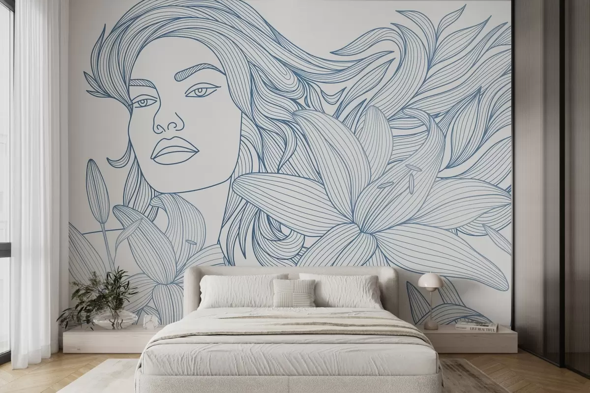 Fotobehang Portret van een meisje in leliebloemen in blauwtinten N° w04689v2