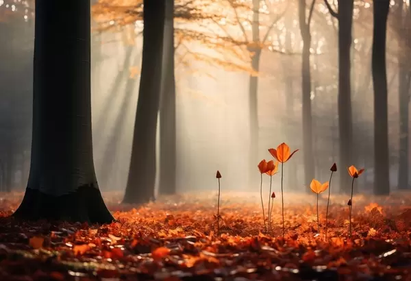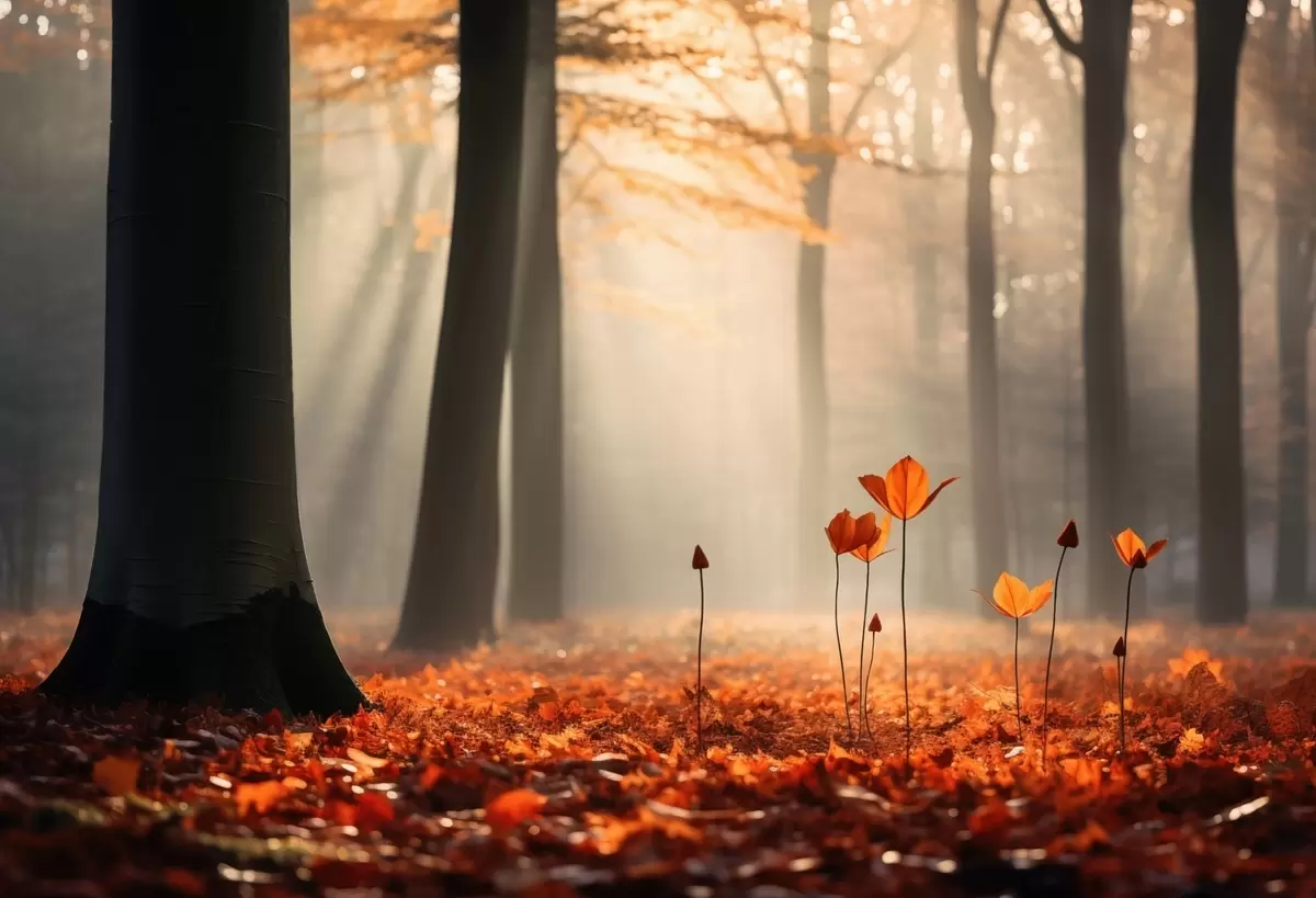 Fotobehang Herfstbos met zonnestralen en helder gebladerte N° w04710