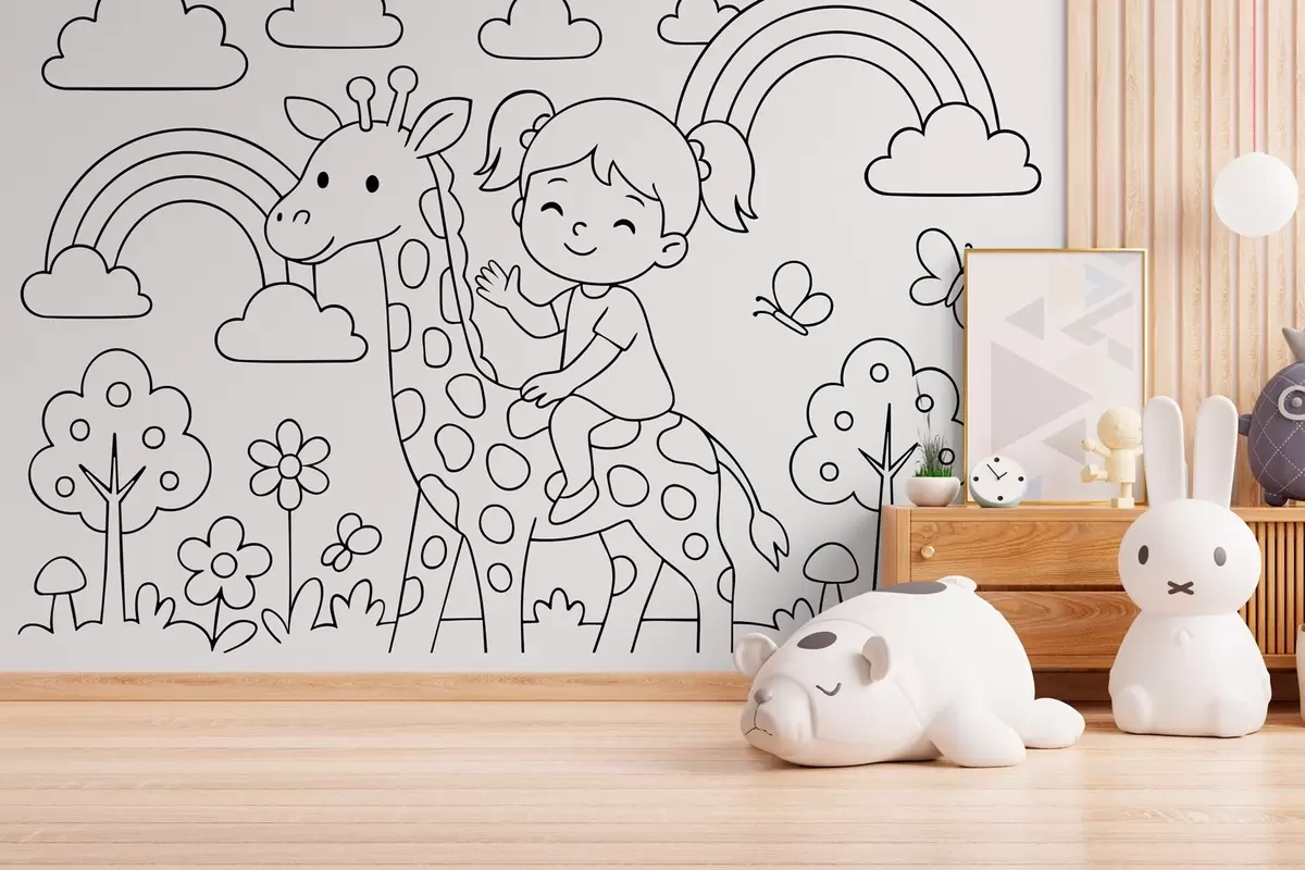 Fotobehang zwart-witte tekening van een meisje op een giraf in de stijl van een kleurboek voor kinderen N° w04753