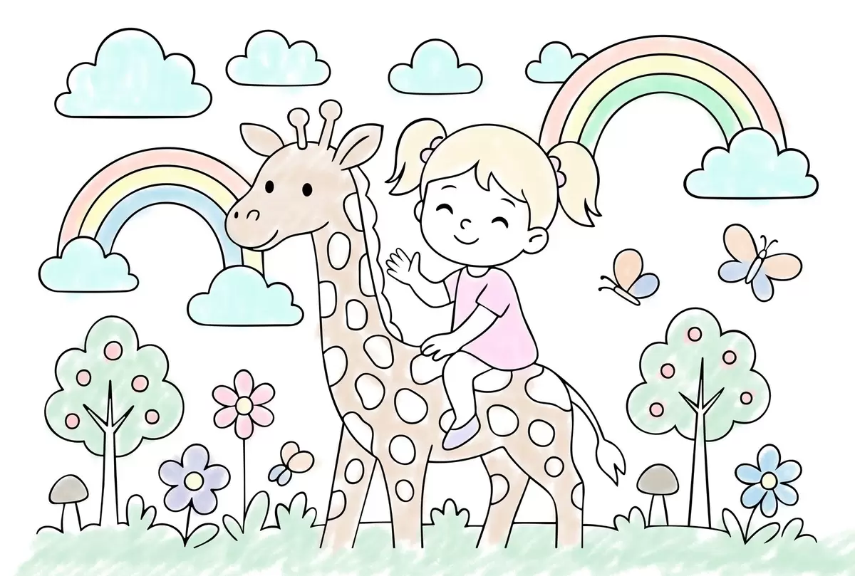 Fotobehang meisje op een giraf in de stijl van een kleurboek voor kinderen N° w04755