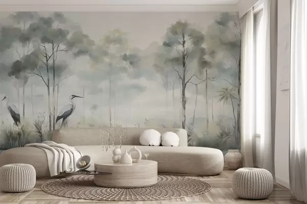 Fotobehang Mistig bos aan het water met reigers, zacht koel kleurenpalet N° w04788