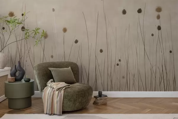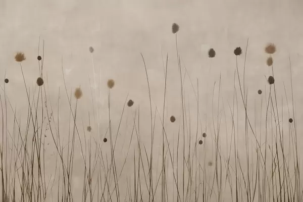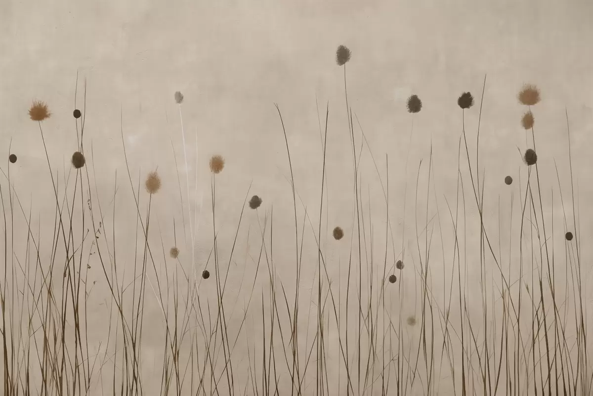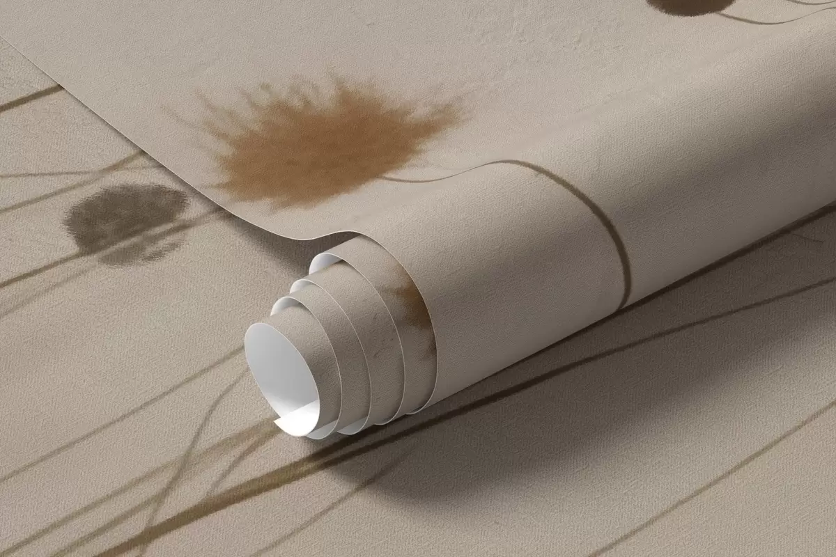 Fotobehang Dunne grassen en pluizige zaadkoppen op een warme beige achtergrond N° w04793