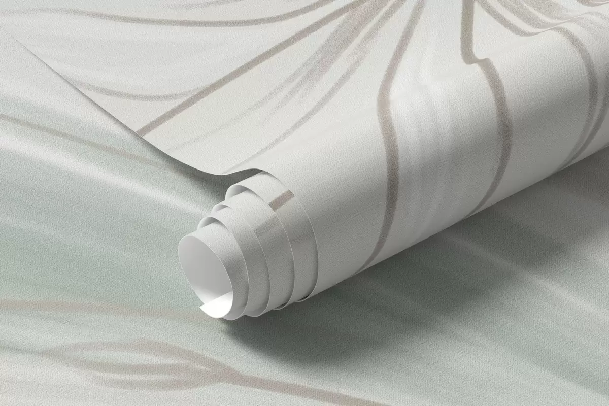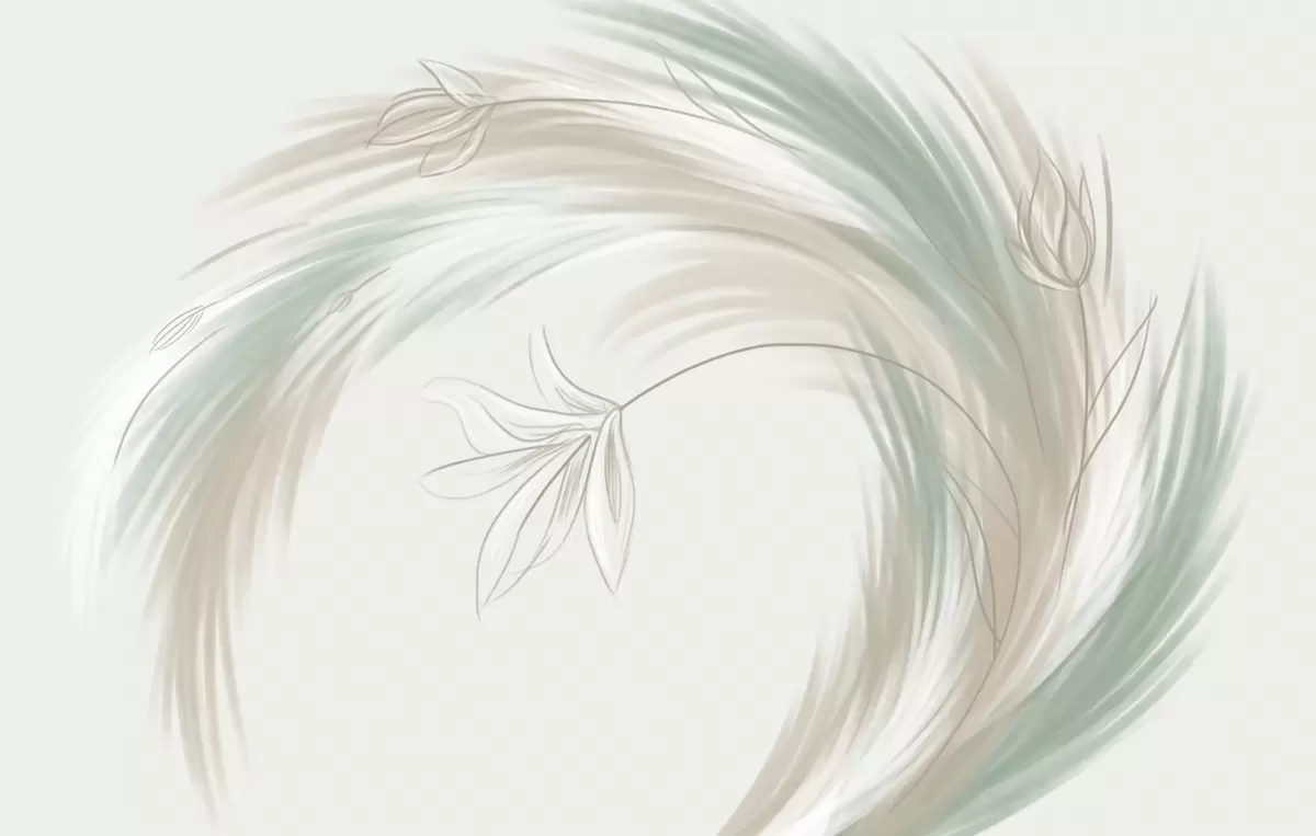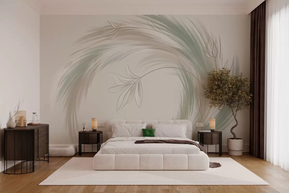 Fotobehang groene en beige veren en bloemen, met de hand geschilderd N° w04816