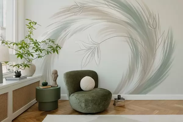 Fotobehang groene en beige veren en bloemen, met de hand geschilderd N° w04816