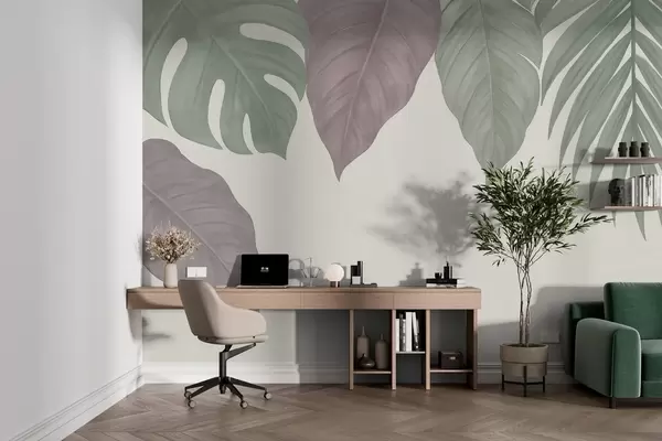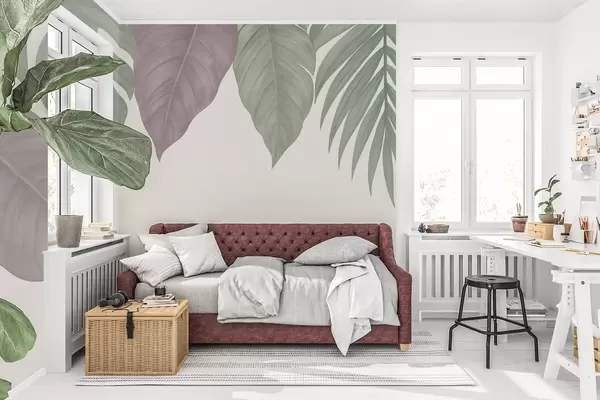 Fotobehang grote tropische bladeren in een eenvoudige stijl, van bovenaf gezien N° w04819
