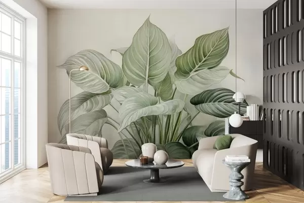 Fotobehang Weelderige struik met groene bladeren aan de muur N° w04835