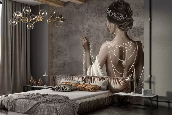 Fotobehang Vrouw gezien van achteren met parels, grijze achtergrond met steenpatroon N° w04854