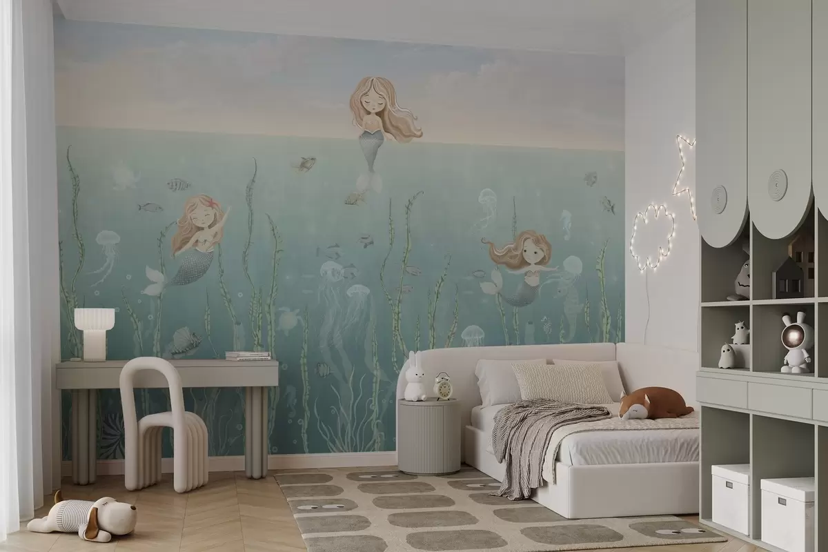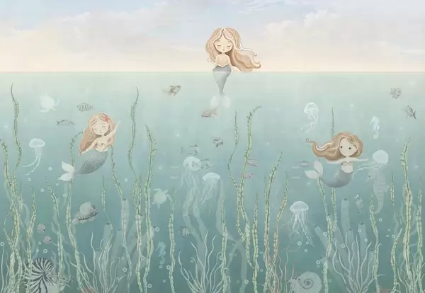 Fotobehang Speelse zeemeerminnen onder water met zeewier, kwallen en vissen N° w04860