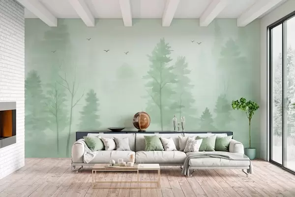 Fotobehang luchtfoto van bos in groene tinten, geschilderd in aquarelstijl N° w04872v1