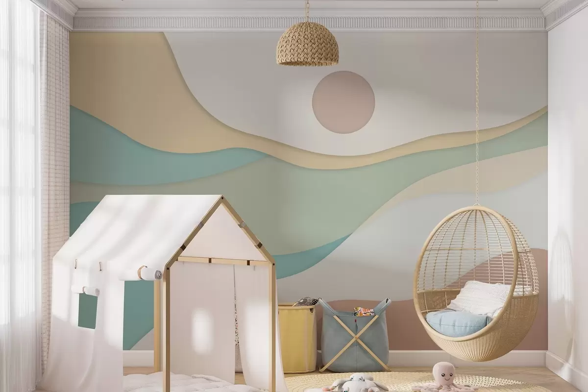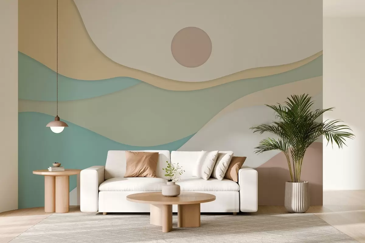 Fotobehang Minimalistische abstractie met zachte, golfachtige vormen die doen denken aan vloeiende landschappen en duinen. N° w04874