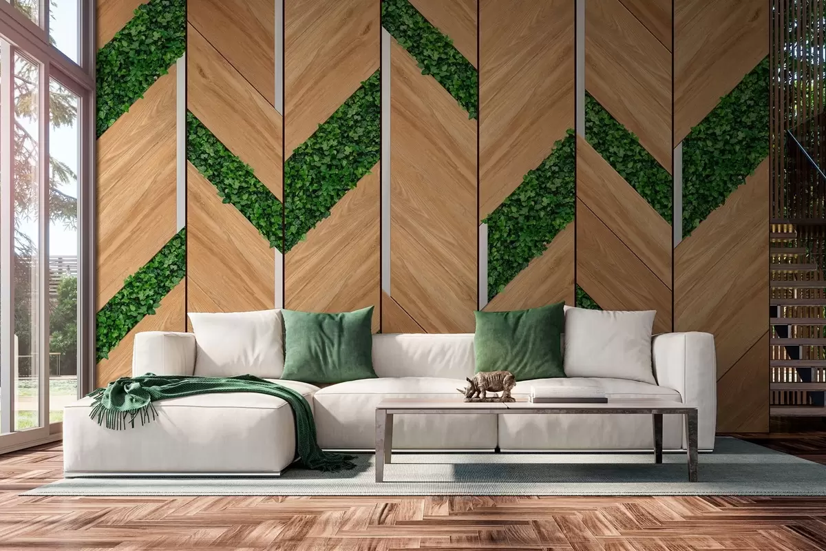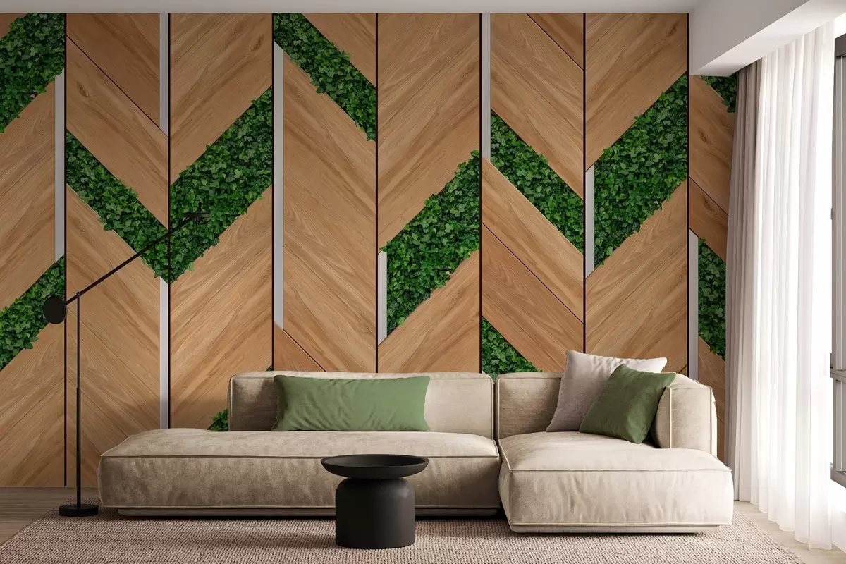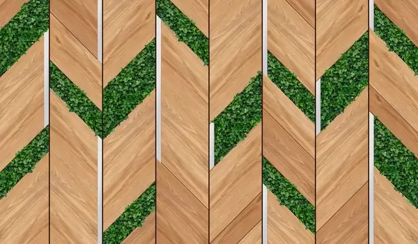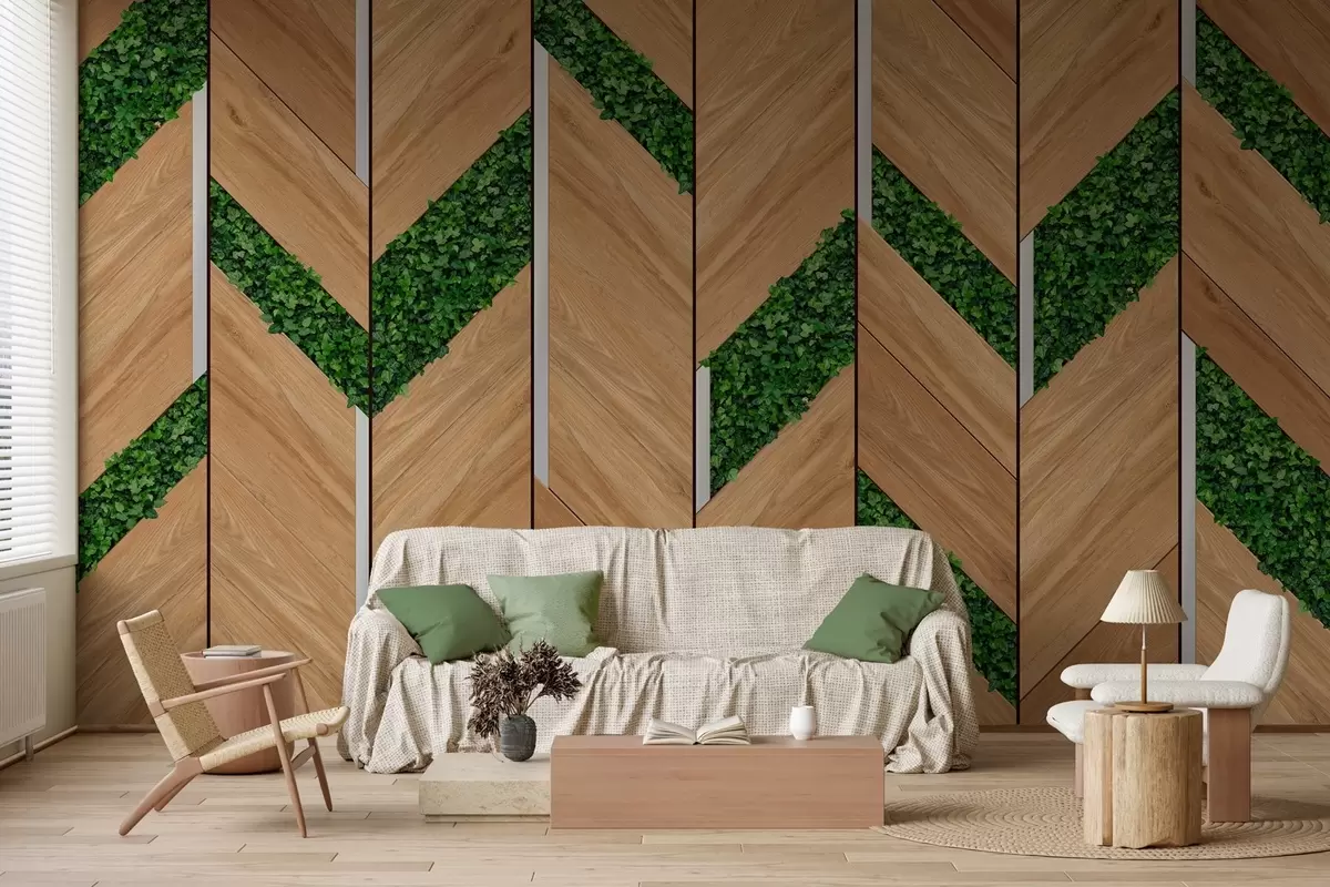 Fotobehang imitatie van lichte houten panelen met planteninserts N° w04875
