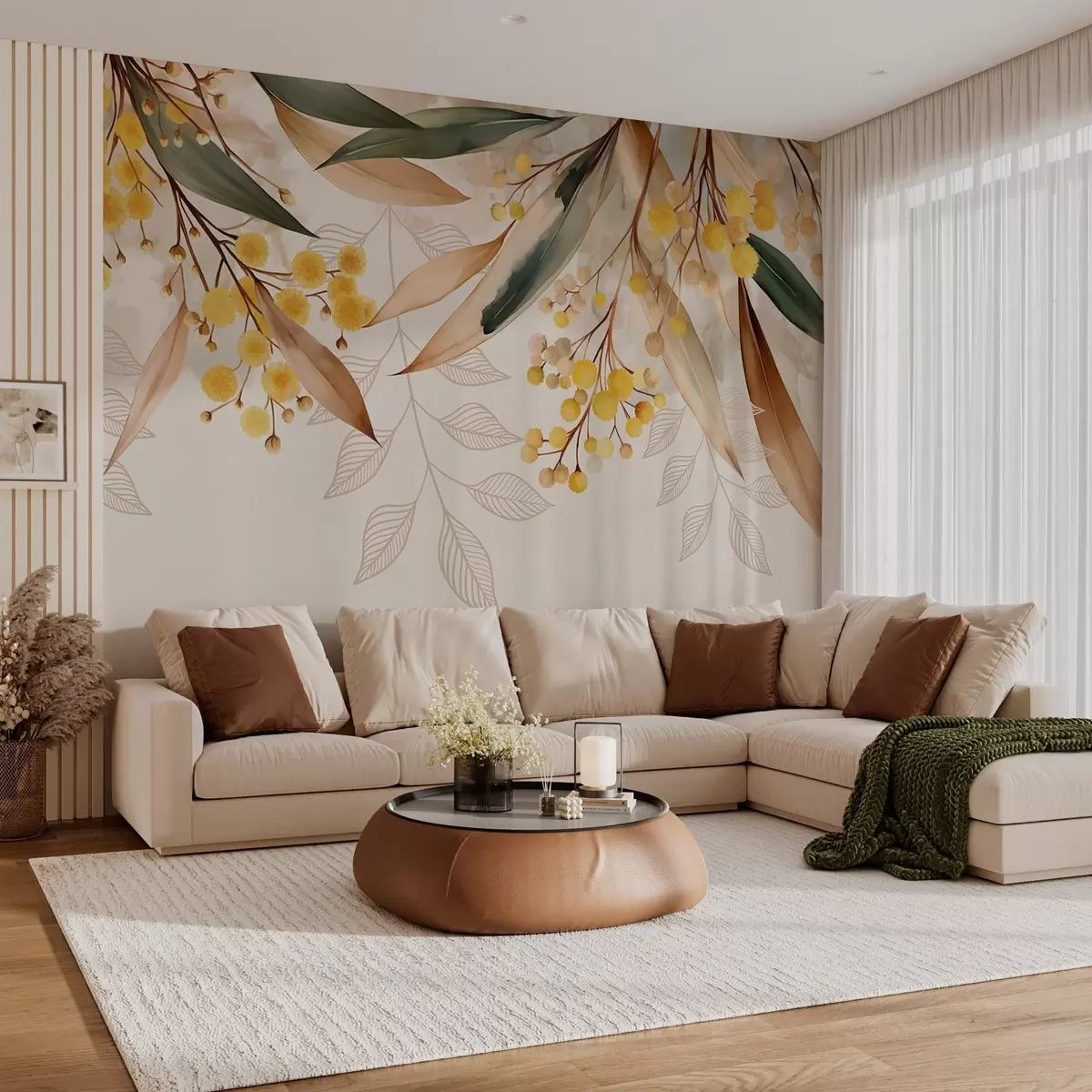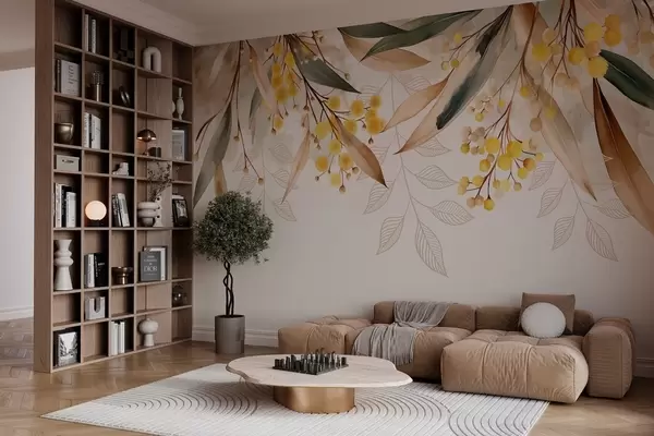 Fotobehang bloemen en bladeren van mimosa die van bovenaf vallen in aquarelstijl N° w04880