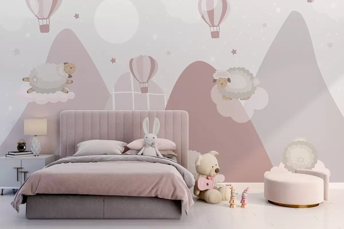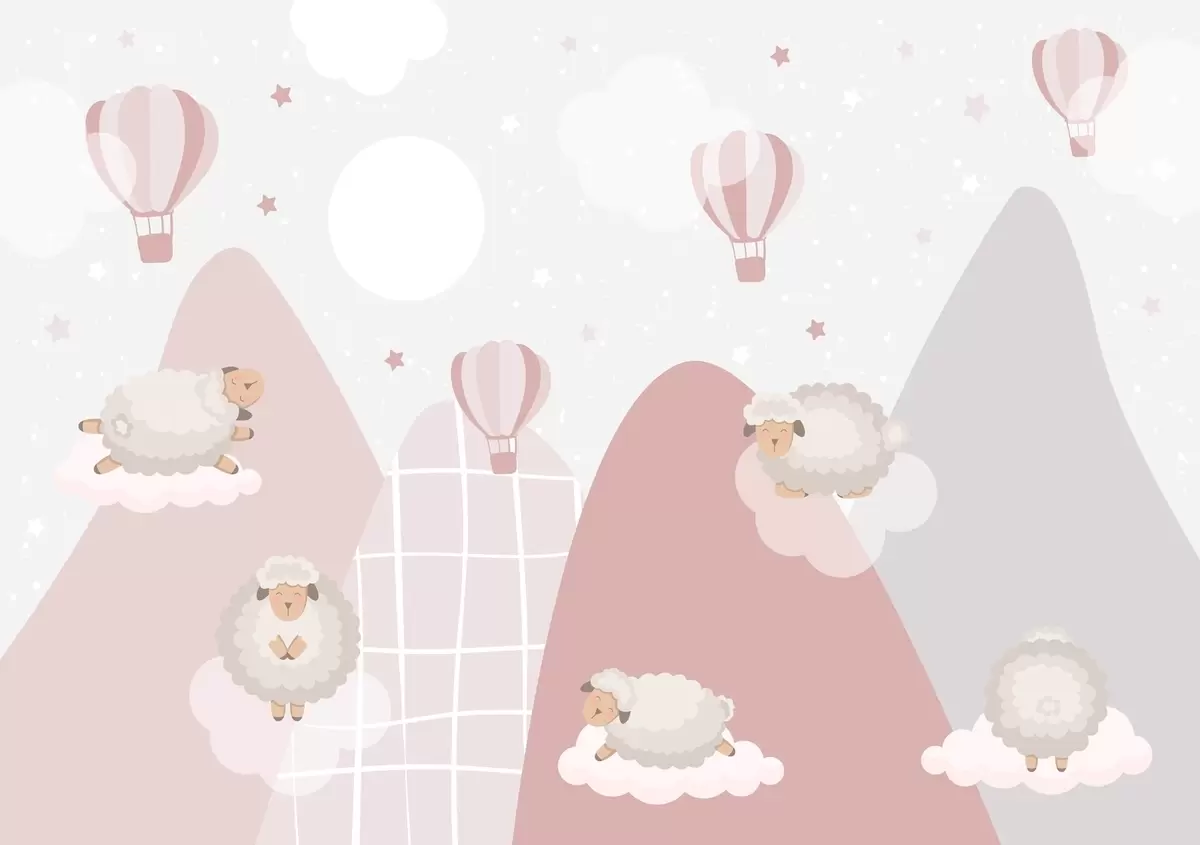 Fotobehang Slapende schapen op roze bergen N° w04932