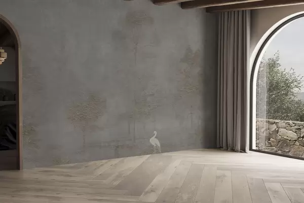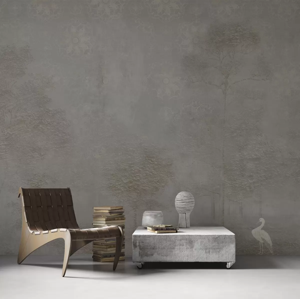 Fotobehang Mistig bos met een reiger en een decoratief patroon erboven N° w04953v1