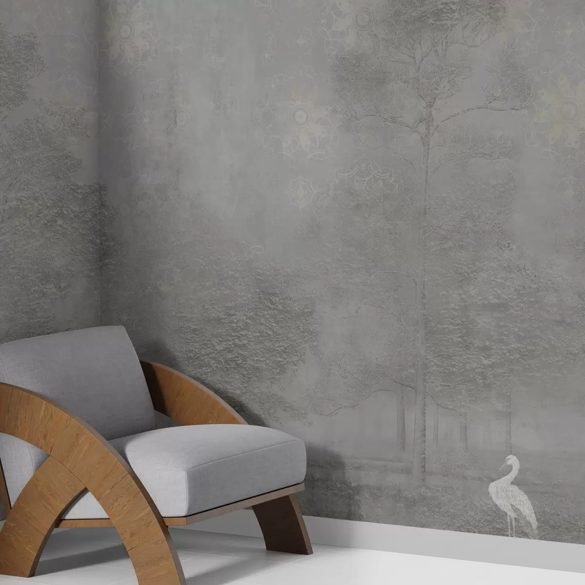 Fotobehang Licht mistig bos met een reiger in koele grijstinten N° w04953v2