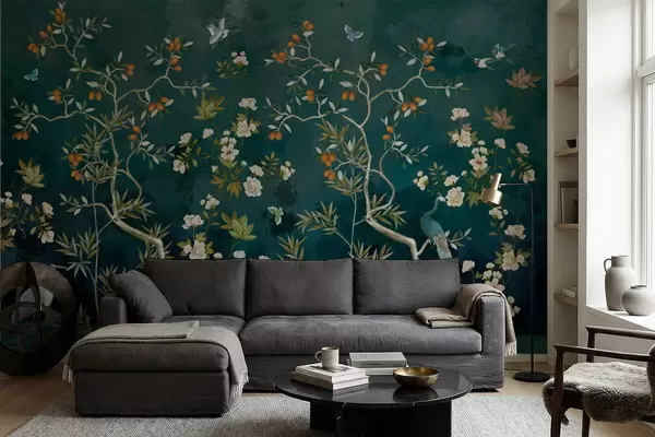 Fotobehang Decoratieve scène met bomen, bloemen en vogels op donkere achtergrond N° w05004