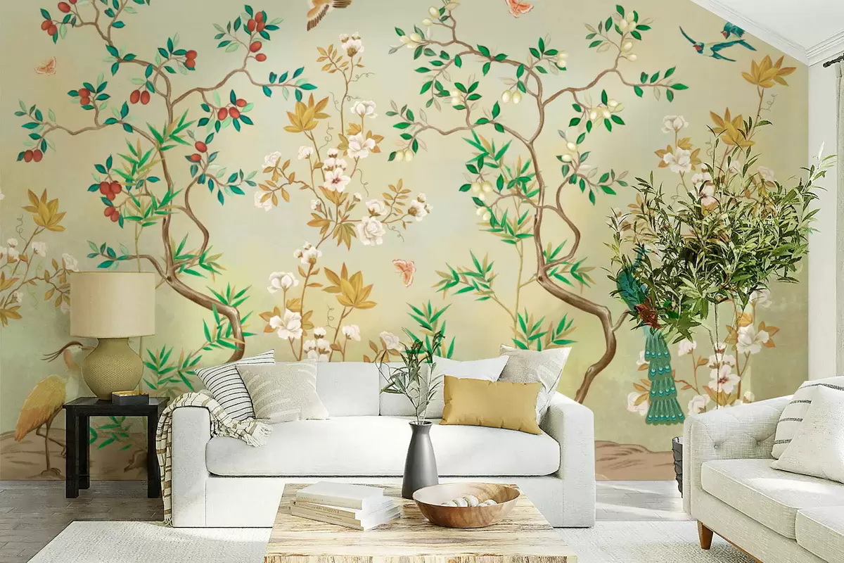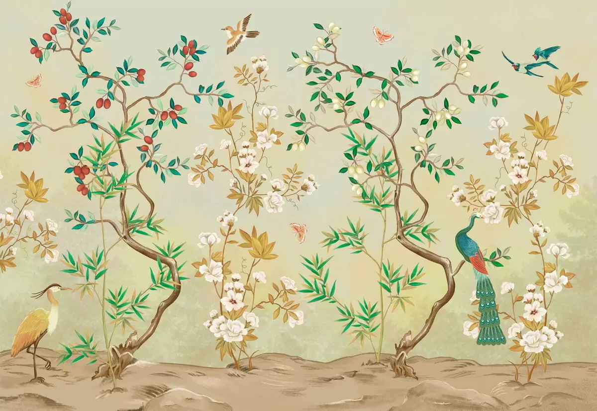 Fotobehang Scène met bomen, bloemen en vogels, lichte achtergrond N° w05004v1
