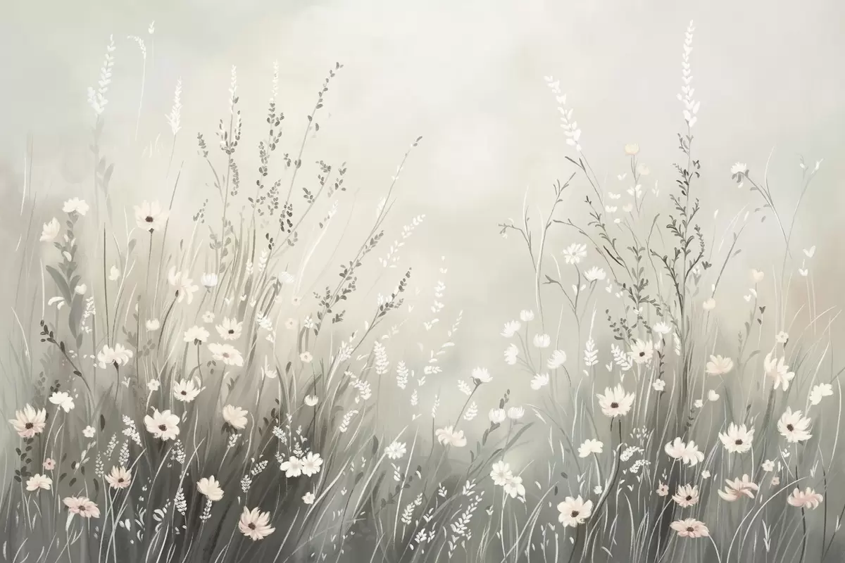 Fotobehang Zachte weidescène met witte bloemen en delicate grassen N° w05015v1