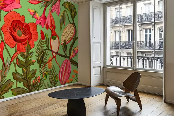 Fotobehang Decoratieve bloemen en vogels op groene achtergrond N° w05036v1