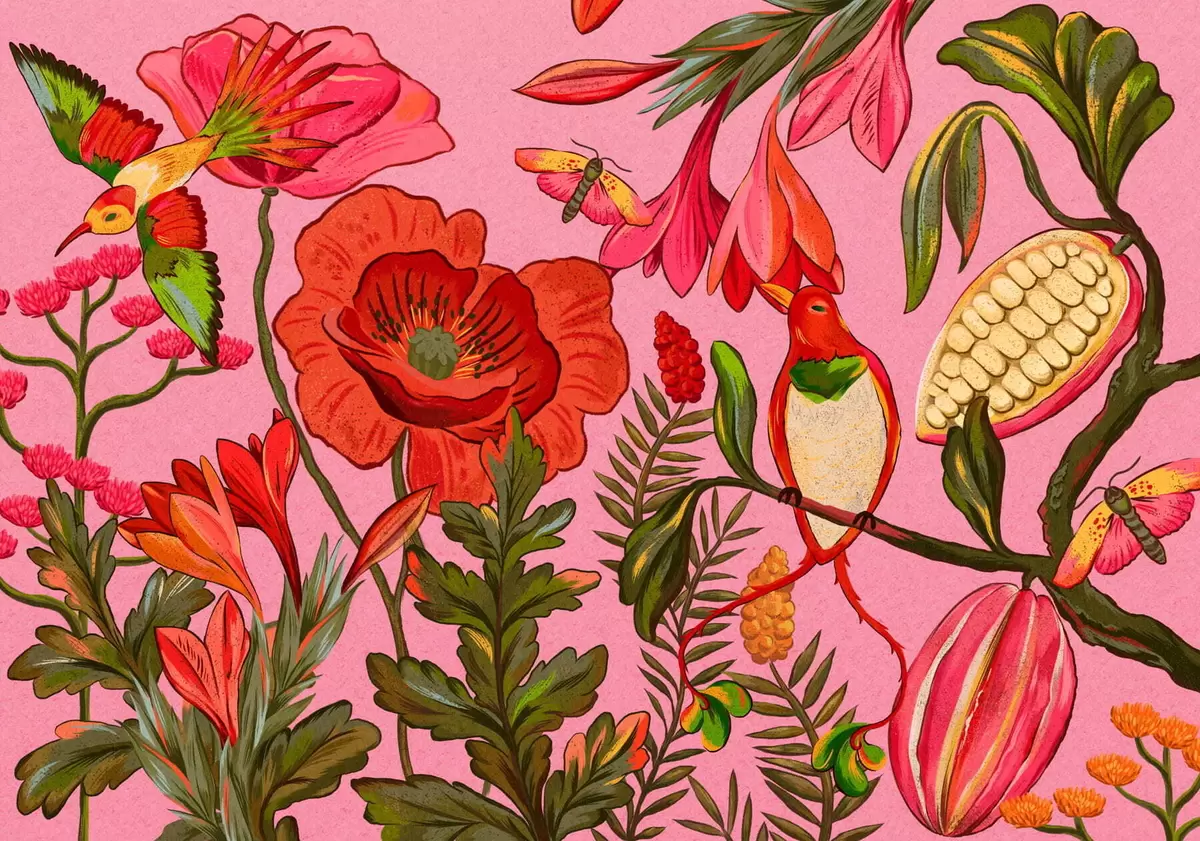 Fotobehang Decoratieve bloemen en vogels op roze achtergrond N° w05036v2