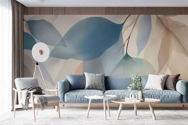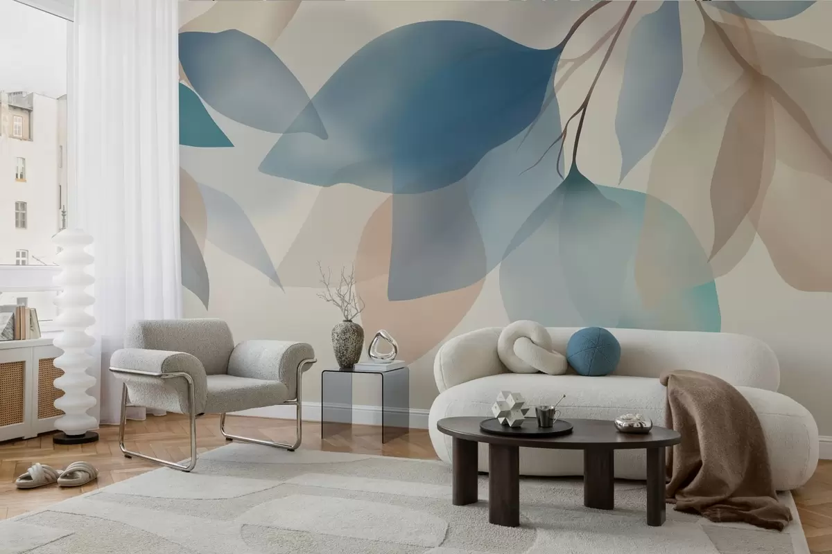 Fotobehang elegante, halfdoorzichtige bladeren in blauw- en beigetinten N° w05060