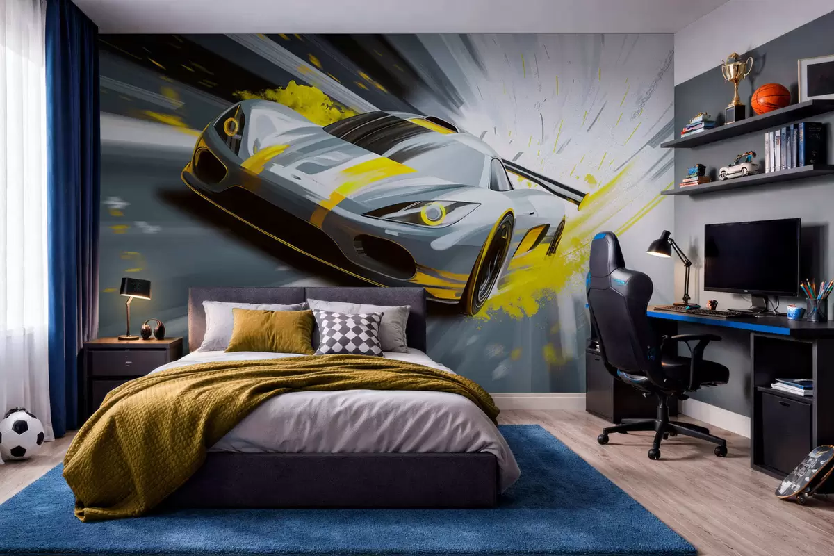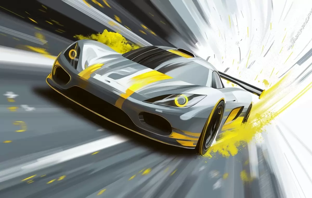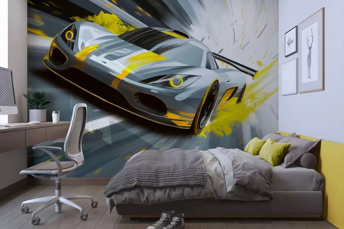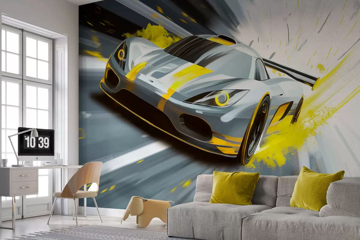Fotobehang dynamische sportwagen in digitale tekenstijl met gele accenten N° w05069v2