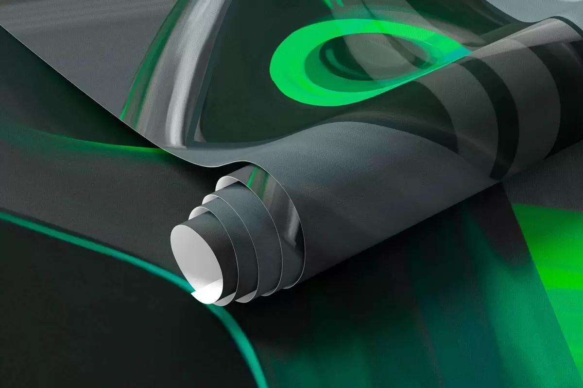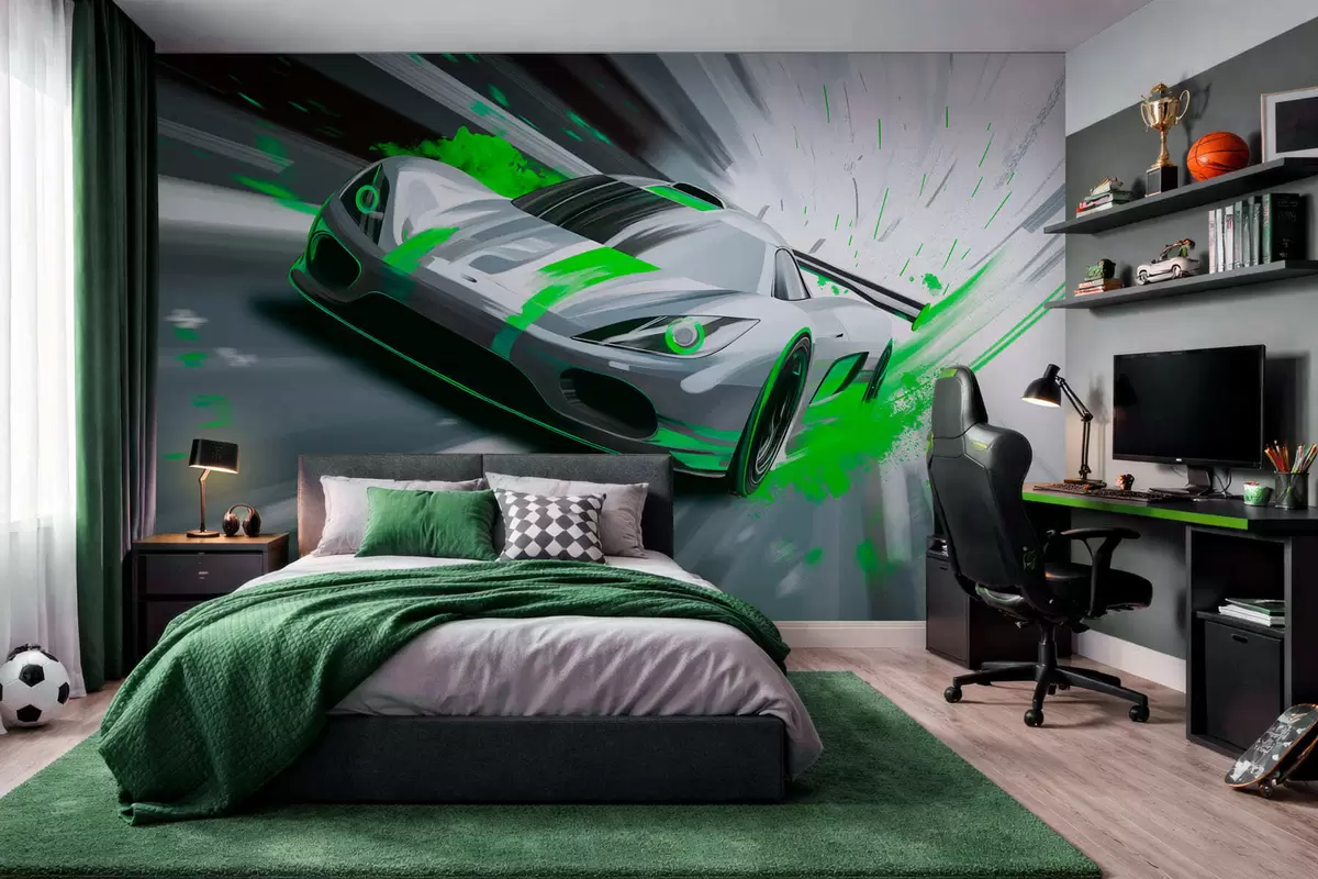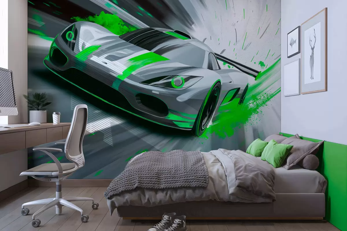Fotobehang dynamische sportwagen in digitale tekenstijl met groene accenten N° w05069v4