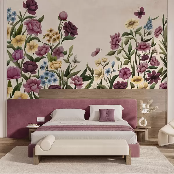 Fotobehang Bloemstuk met planten en vlinders op lichte achtergrond N° w05072
