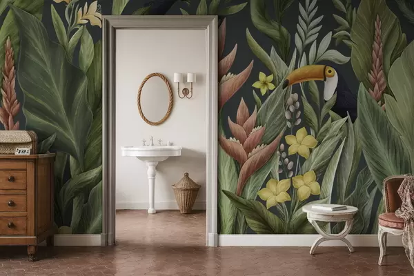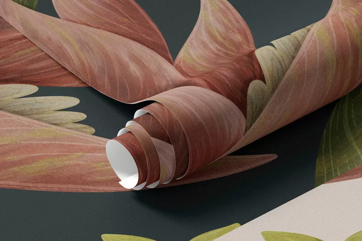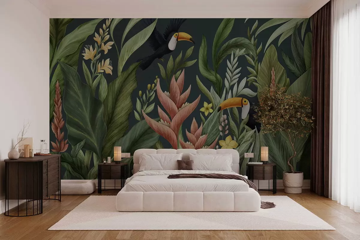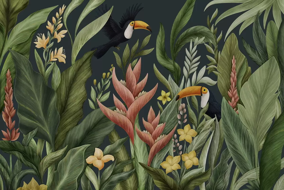 Fotobehang Tropische planten en vogels met grote snavels op donkere achtergrond N° w05088v2