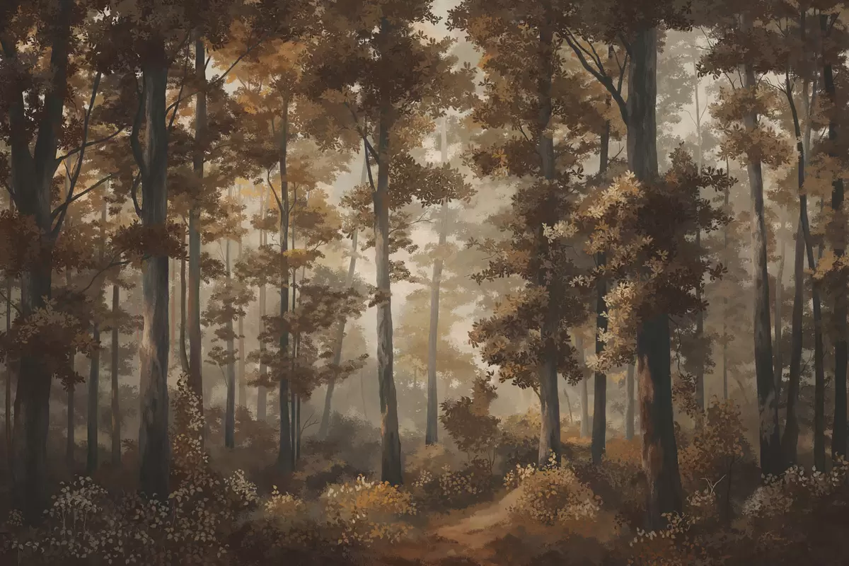 Fotobehang Herfstbos met warm licht en dichte bomen N° w05089v1