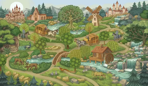 Fotobehang Nachtelijke sprookjesachtige scène met kastelen, molens en bos N° w05091