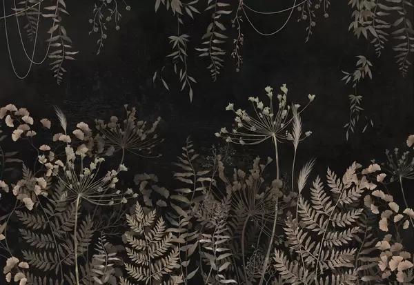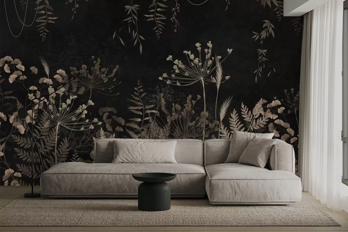 Fotobehang Donker botanisch patroon met bloemen en bladeren N° w05092