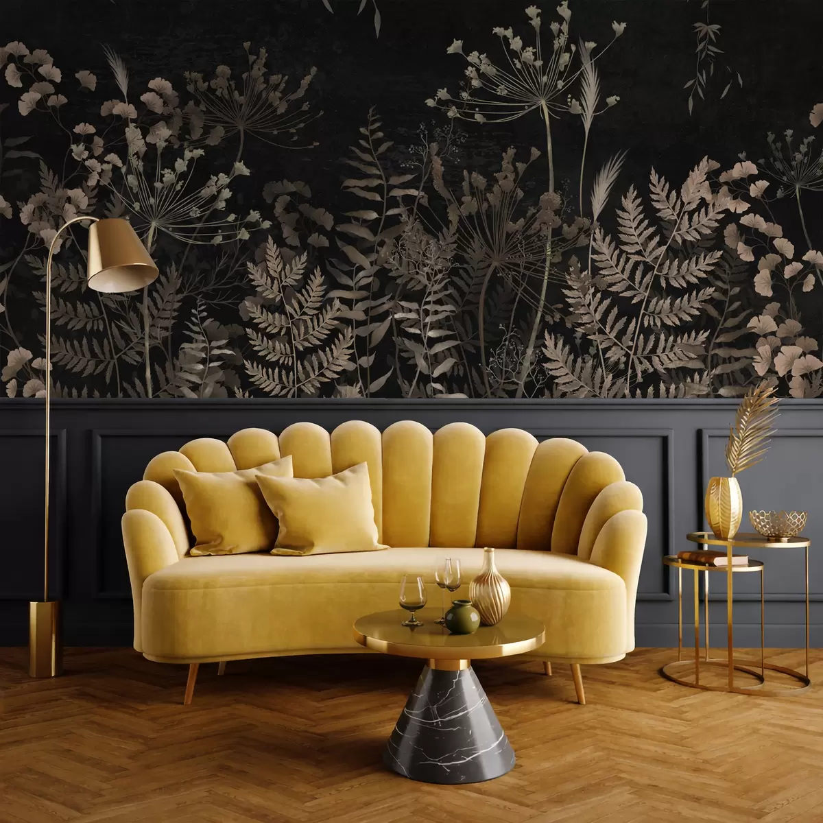 Fotobehang Donker botanisch patroon met bloemen en bladeren N° w05092