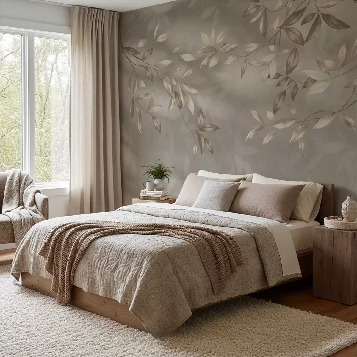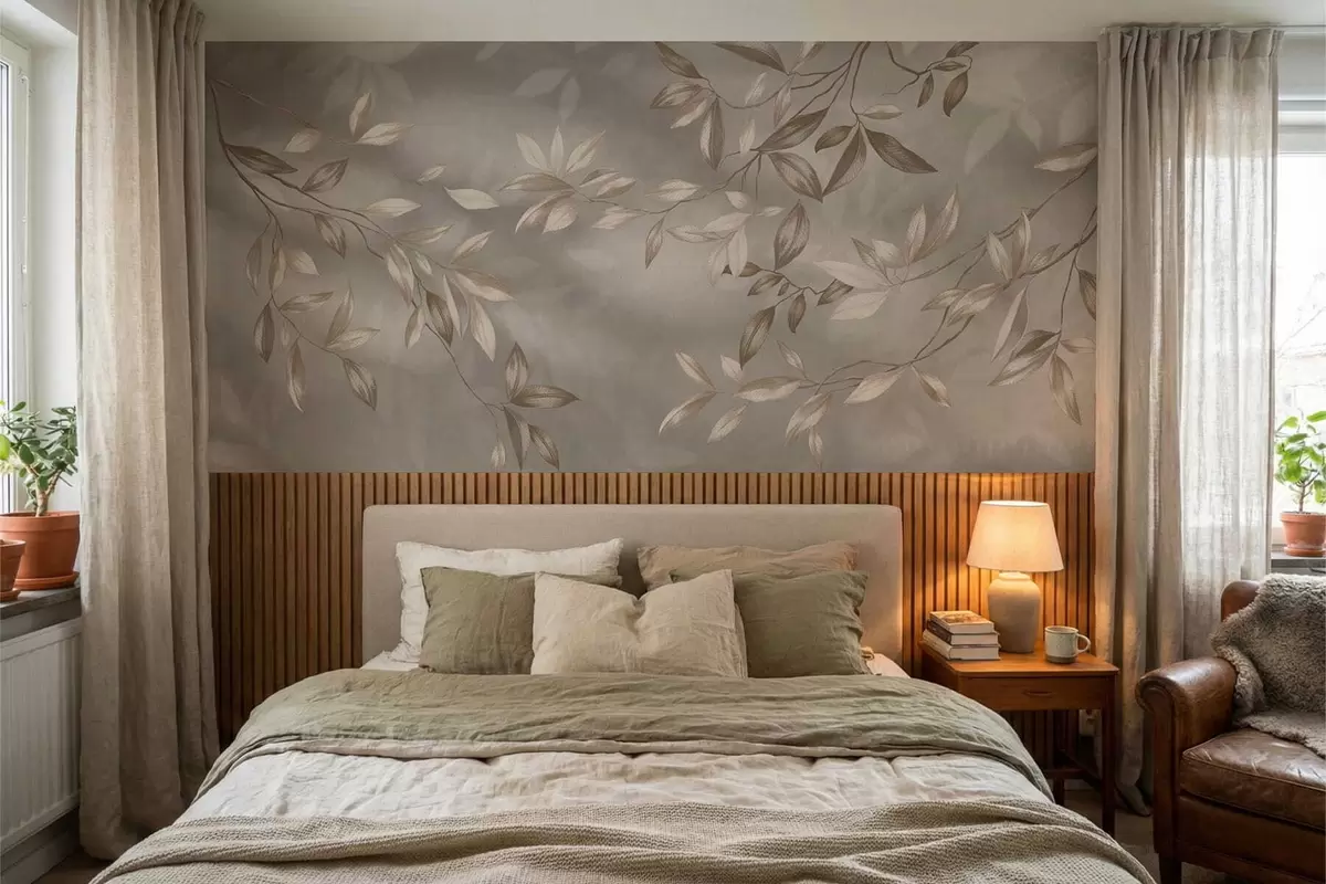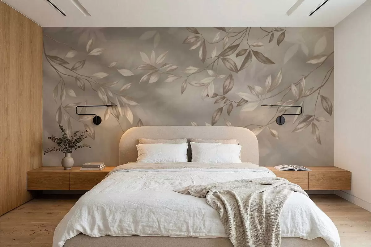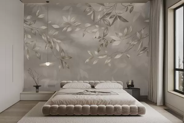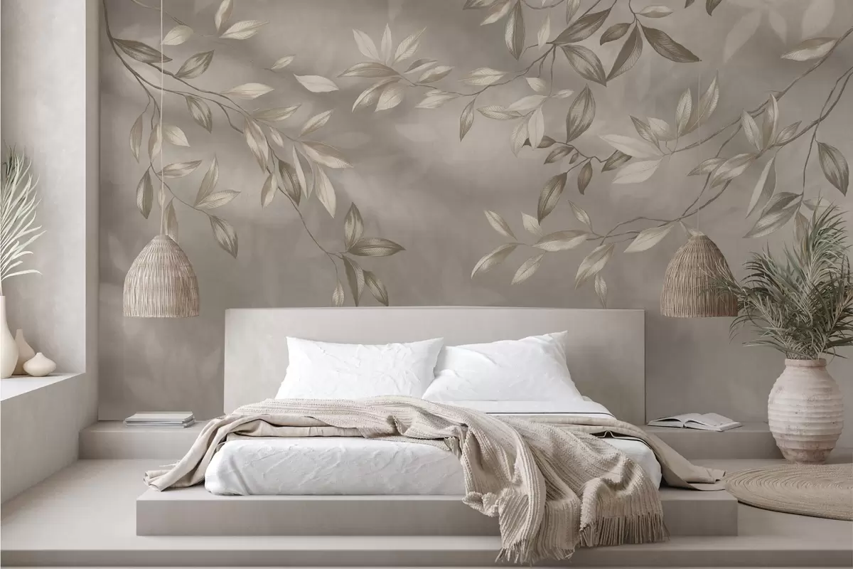 Fotobehang Elegante bladrijke takken in beige tinten op een lichte achtergrond N° w05113